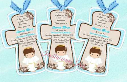 Hermosa invitación en forma de cruz, con un ángel en la parte inferior y un moño haciendo que la invitación tenga un toque sencillo y elegante. Incluyen dos boletos por invitación.