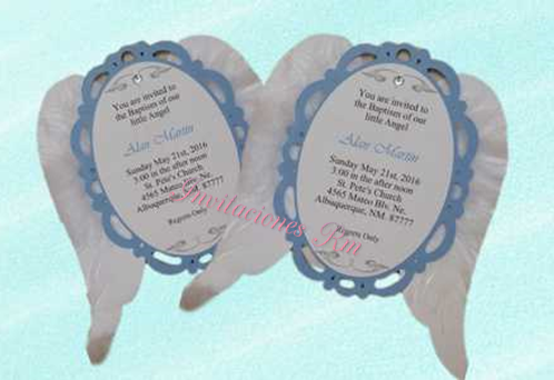 Hermosa invitación decorada con alas de ángel y un contorno tipo porta retrato haciendo que la invitación tenga un toque sencillo y elegante. Incluyen dos boletos por invitación.
