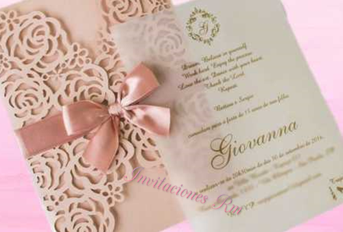 Hermosa invitación , con diseño de rosas grandes en papel opalina, adornada con moño color a elegir haciendo que la invitación tenga un toque sencillo y elegante. Incluyen dos boletos por invitación.