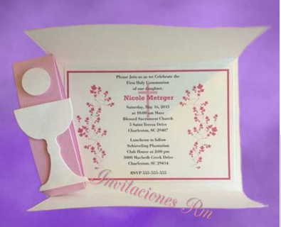 Hermosa invitación con un sencillo diseño de flores en ambos costados y una cintilla hecha con fomi adornada con un cáliz en color mate haciendo que la invitación tenga un toque sencillo y elegante. Incluyen dos boletos por invitación.